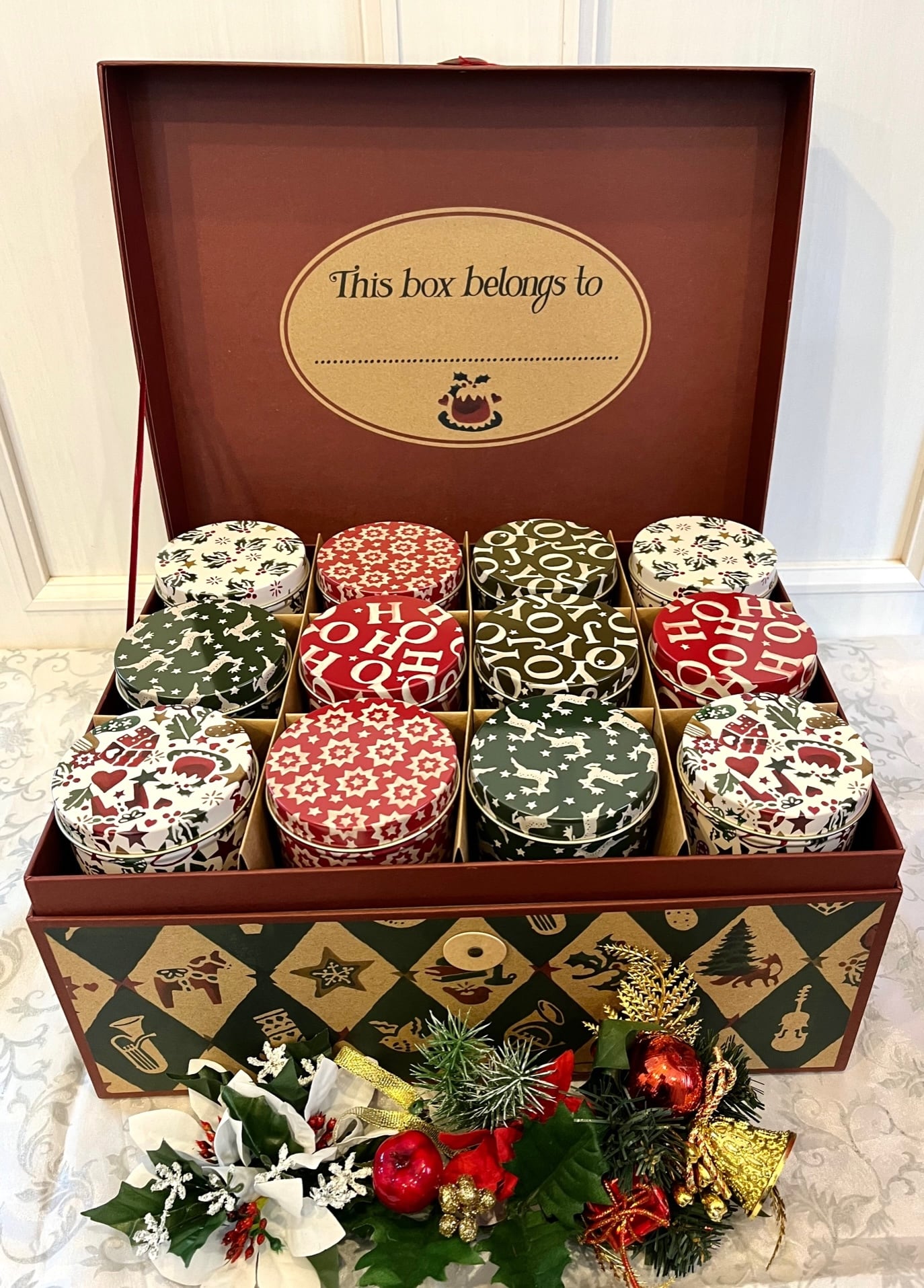 エマ・ブリッジウォーターデザインのクリスマスカレンダー缶BOX。1から24までの数字の缶にそれぞれ紅茶やフルーツティーを入れてご用意しました。アドベントの期間に、24種のお茶をお楽しみいただける特別なBOXです。